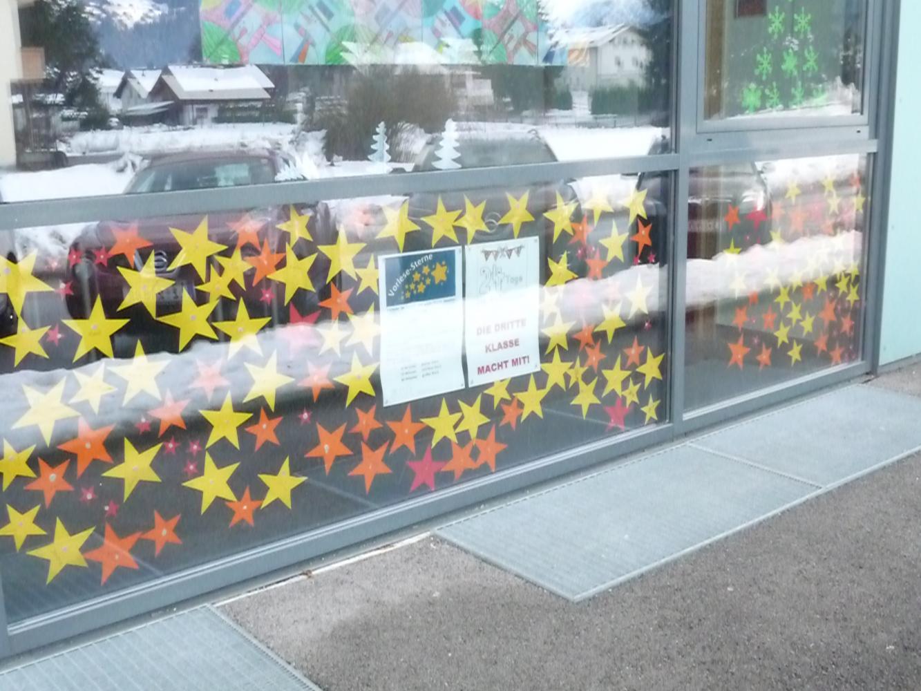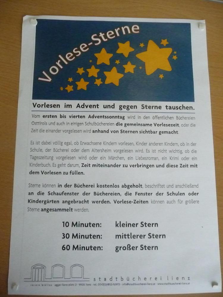 Angeregt durch die Vorlese-Sterne-Aktion der Stadtbücherei Lienz machte auch die 3. Klasse jene Zeit, die VORGELESEN wird, anhand von Sternen am Schulhausfenster sichtbar. So las die Klassenlehrerin ihren Drittelern täglich am Adventkranz weihnachtliche Adventkalender-Geschichten vor. Die Kinder lasen sich anschließend gegenseitig aus Weihnachtsbüchern der Klassenbücherei vor. Auch der Schulleiter und die Nachbarklassenlehrerin sowie die Eltern, Großeltern zuhause wurden zum Vorlesen eingeladen. Kinder erzählten begeistert, dass sie sogar ihren Haustieren vorgelesen hatten. Insgesamt kam die stattliche Gesamtvorlesezeit von 5.221 min heraus – bravo, bravo an alle, die mitgewirkt haben. Die Lesebegeisterung war wirklich ansteckend und begeisternd!