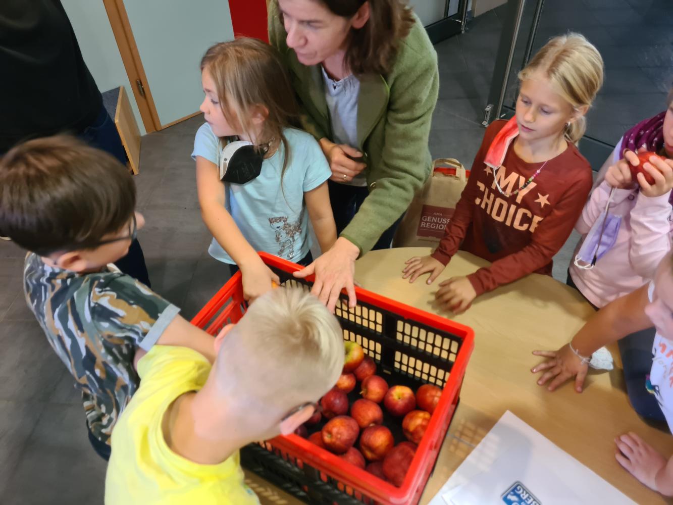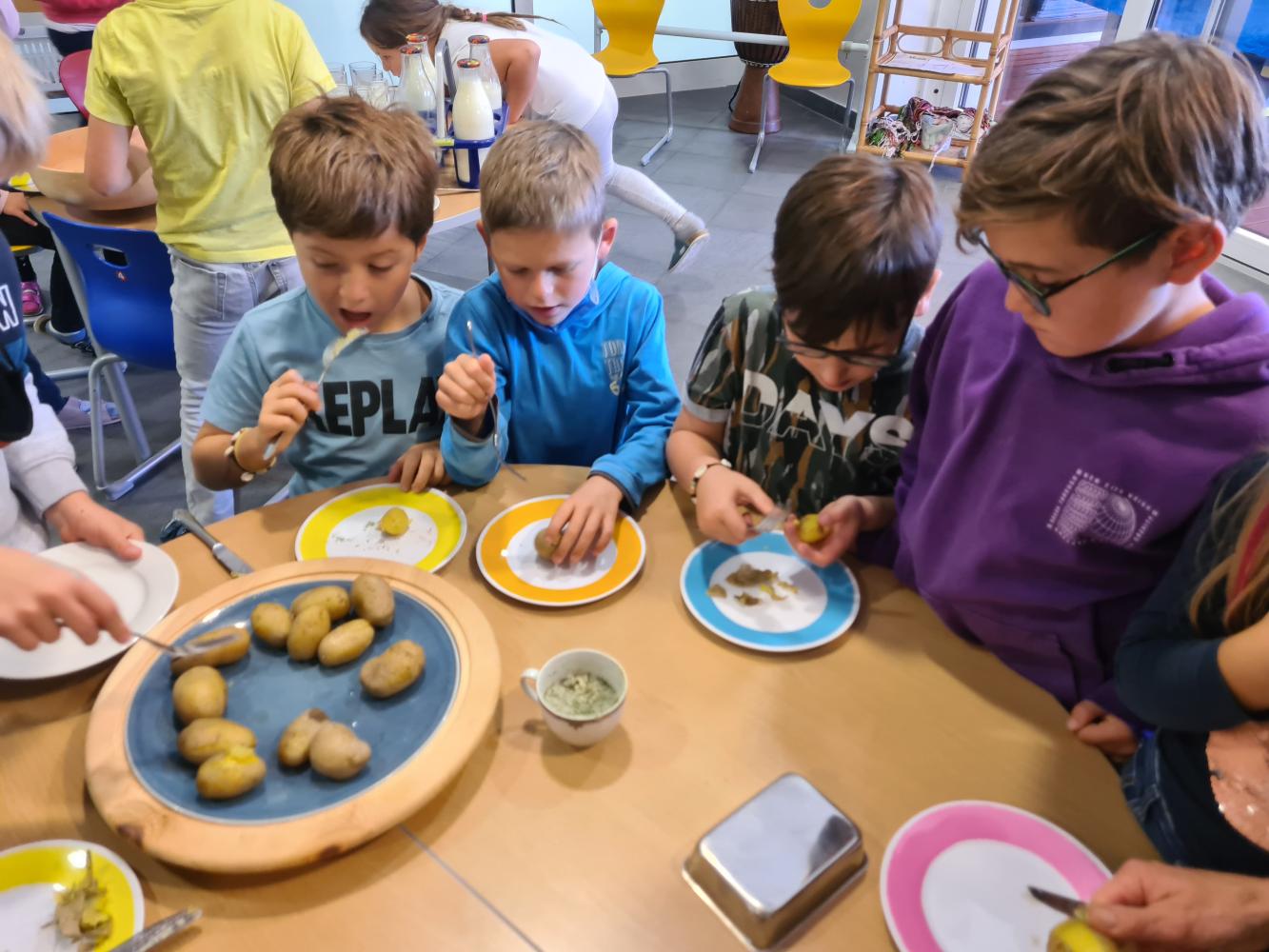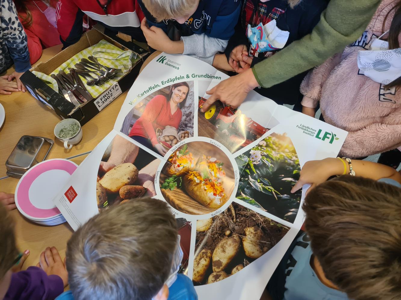 Im Rahmen des Welternährungstages am 16. Oktober besuchten die Tristacher Bäuerinnen die Kinder der zweiten Klasse. Ziel war es, den Schülern die guten heimischen Produkte wie Kartoffeln, Äpfel, Milch und Käse näher zu bringen. Dabei wurden nicht nur die vielseitigen Verarbeitungsmöglichkeiten der einzelnen Produkte besprochen, sondern auch die verschiedenen österreichischen Gütesiegel erklärt, die unsere heimischen Produkte auszeichnen. Zum Abschluss durften sich die Kinder mit gekochten Kartoffeln, Käse, Butter, Milch und einem Apfel stärken. Die Zweitklässler hatten bei dieser lehrreichen Stunde sehr viel Spaß.