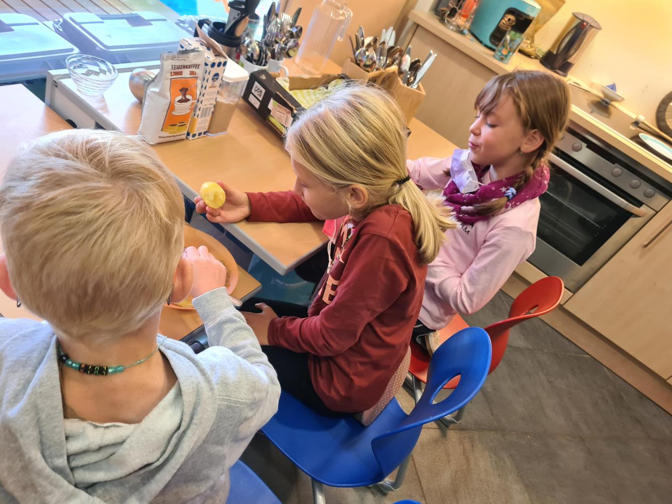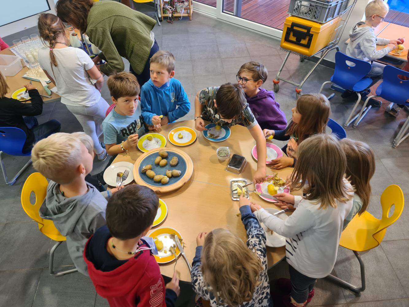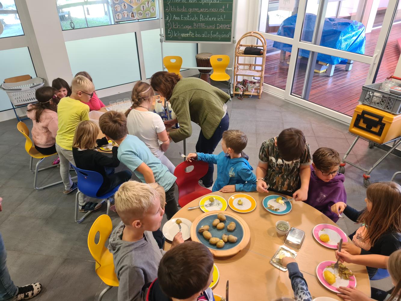 Im Rahmen des Welternährungstages am 16. Oktober besuchten die Tristacher Bäuerinnen die Kinder der zweiten Klasse. Ziel war es, den Schülern die guten heimischen Produkte wie Kartoffeln, Äpfel, Milch und Käse näher zu bringen. Dabei wurden nicht nur die vielseitigen Verarbeitungsmöglichkeiten der einzelnen Produkte besprochen, sondern auch die verschiedenen österreichischen Gütesiegel erklärt, die unsere heimischen Produkte auszeichnen. Zum Abschluss durften sich die Kinder mit gekochten Kartoffeln, Käse, Butter, Milch und einem Apfel stärken. Die Zweitklässler hatten bei dieser lehrreichen Stunde sehr viel Spaß.