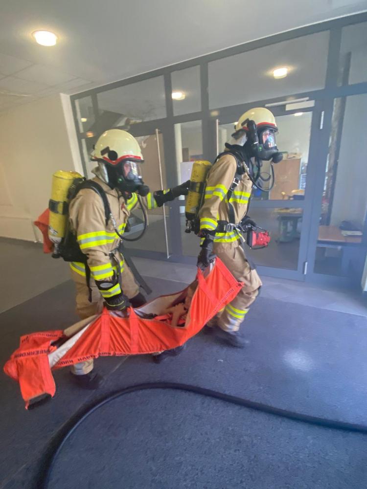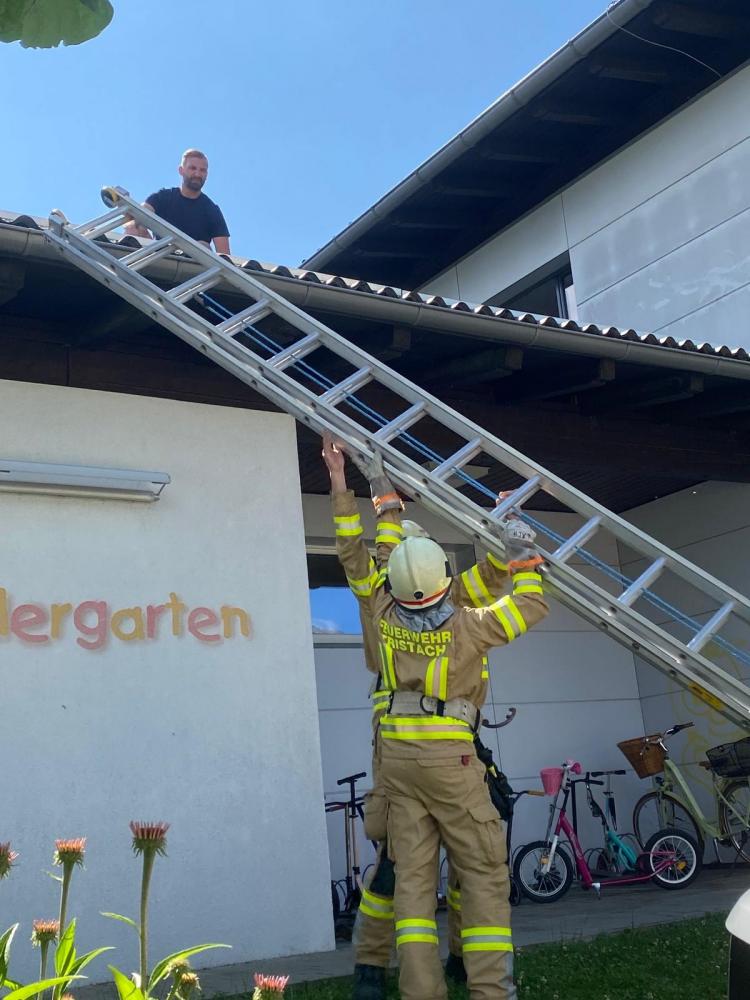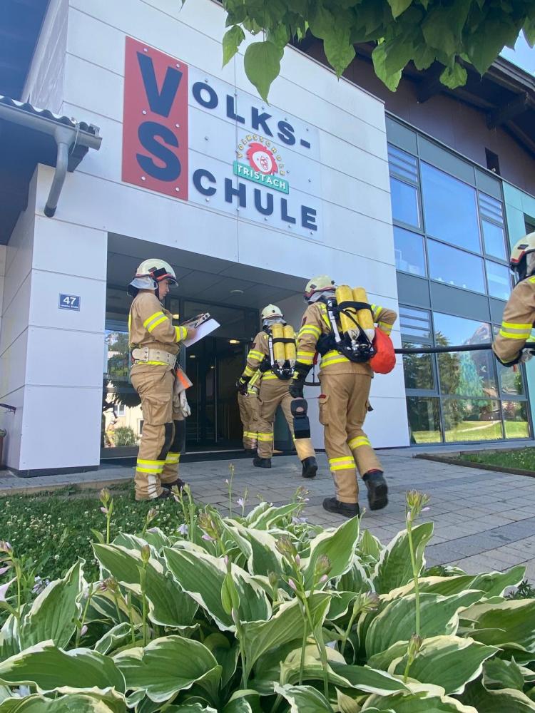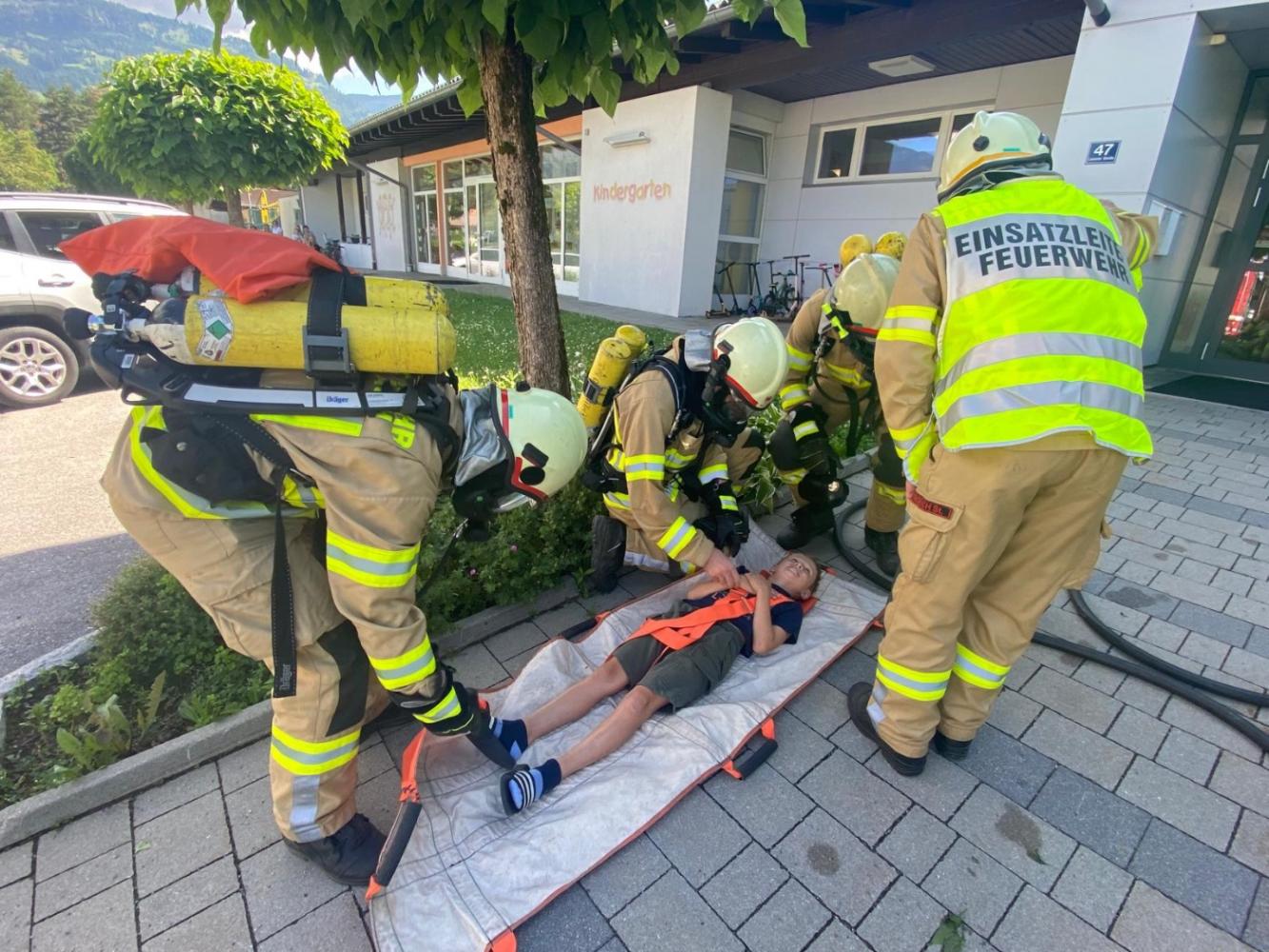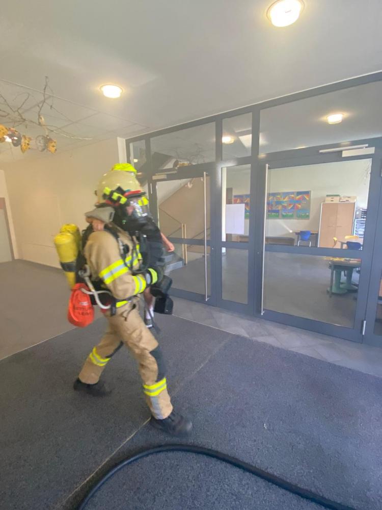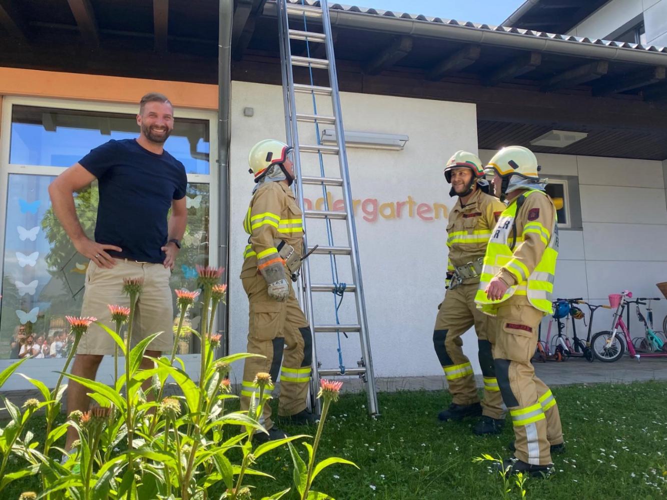 Dichte Rauchschwaden aus Nebelmaschinen sorgten für realistische Bedingungen. Zwei Kinder wurden mit Trage und Atemschutzmaske sicher geborgen, der Schulleiter spektakulär mit der Leiter vom Dach gerettet. Als Dankeschön überreichten die Kinder der Feuerwehr ein liebevoll gestaltetes Plakat – ein kleines Zeichen großer Anerkennung.