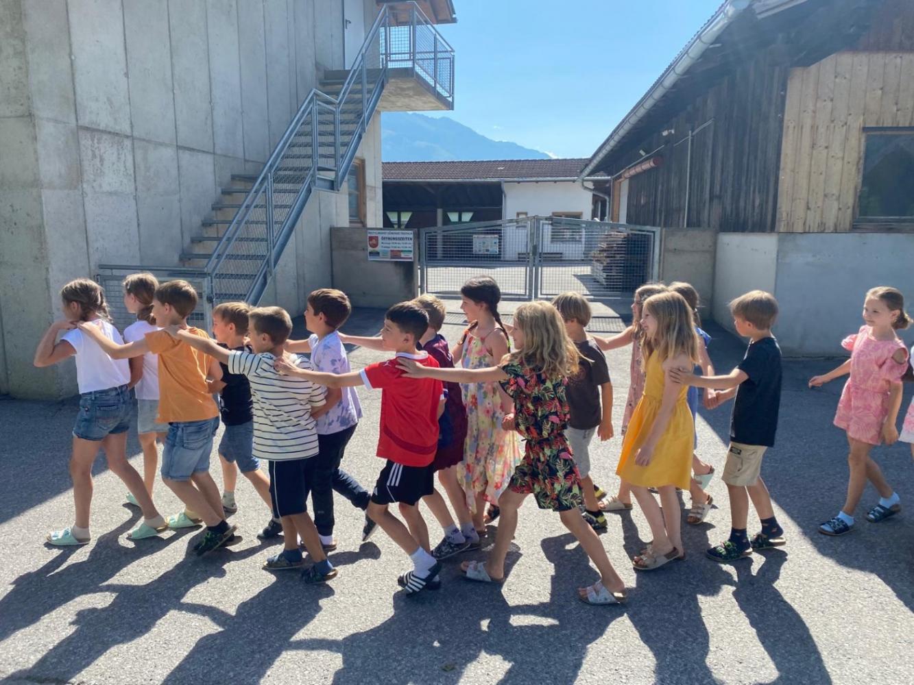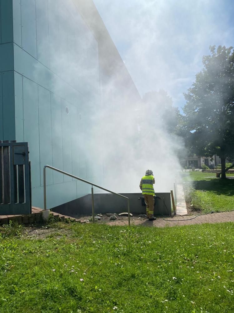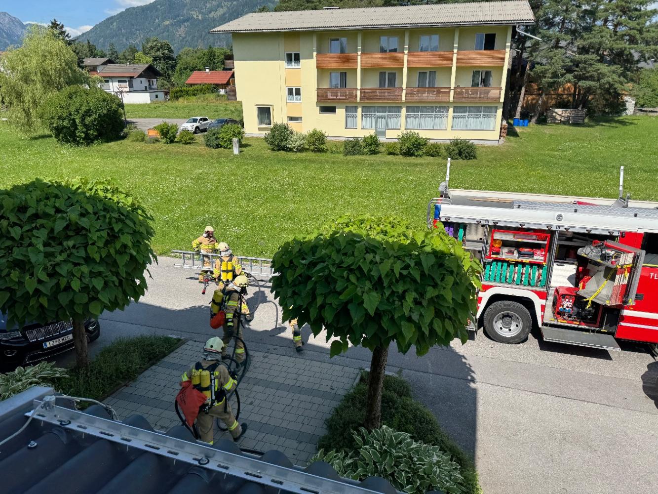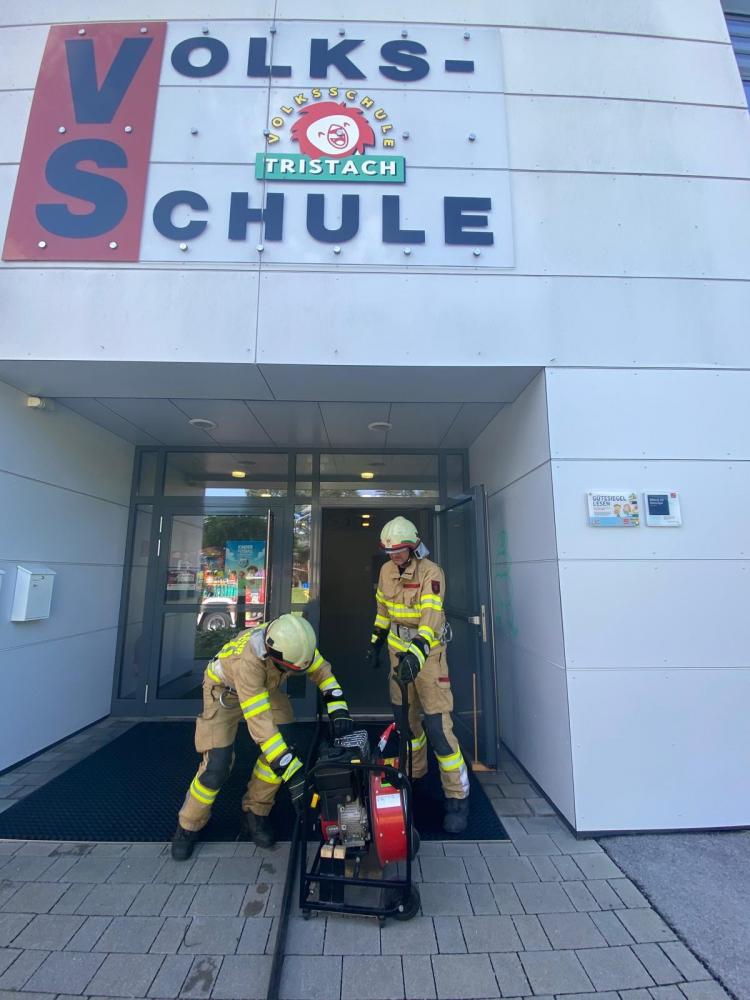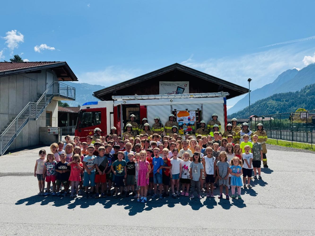 Dichte Rauchschwaden aus Nebelmaschinen sorgten für realistische Bedingungen. Zwei Kinder wurden mit Trage und Atemschutzmaske sicher geborgen, der Schulleiter spektakulär mit der Leiter vom Dach gerettet. Als Dankeschön überreichten die Kinder der Feuerwehr ein liebevoll gestaltetes Plakat – ein kleines Zeichen großer Anerkennung.