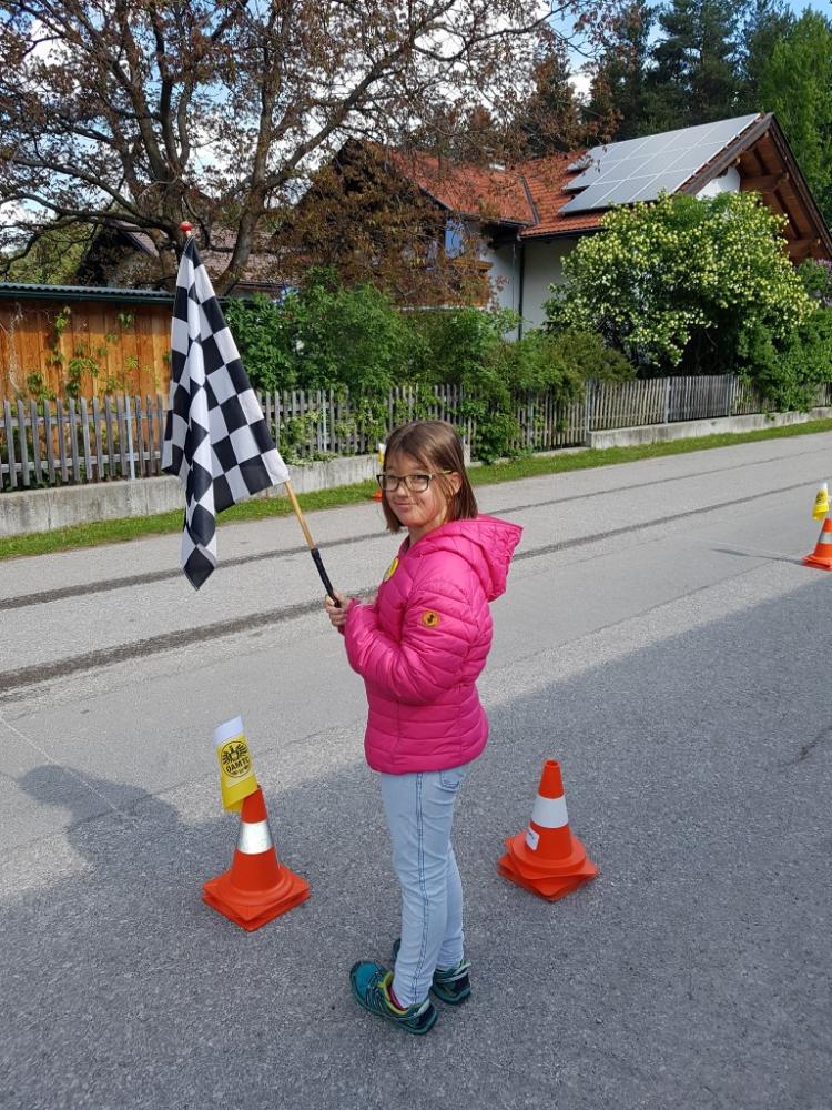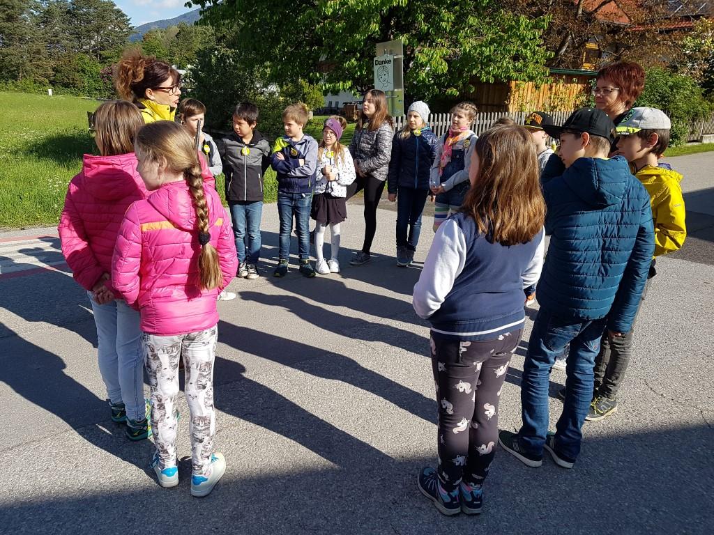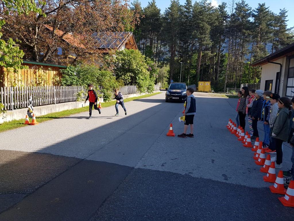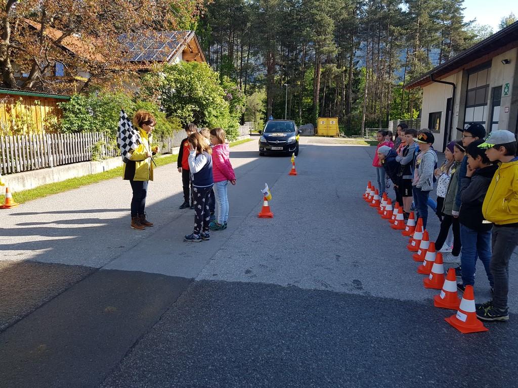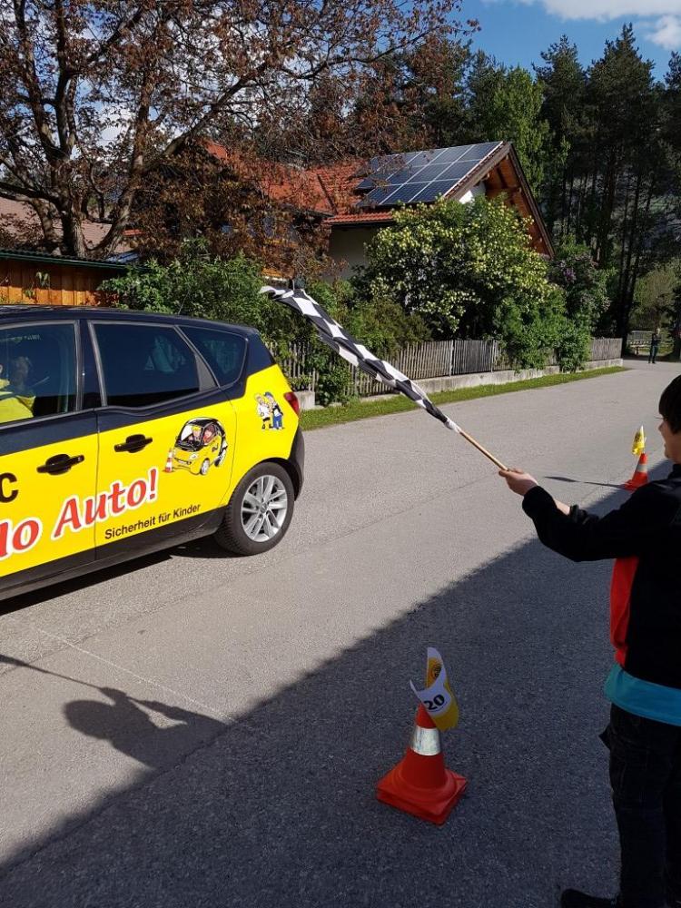 Bei dieser Aktion wurde im Rahmen der Verkehrssicherheit der Anhalteweg eines Autos durch Selbsterfahrung erarbeitet. Zuerst stellten die Kinder aus dem Laufen heraus ihren eigenen Bremsweg fest, bevor sie mit Josy von „Hallo Auto“ selbst ins Auto stiegen, um eine Notbremsung auf nasser Fahrbahn durchzuführen.