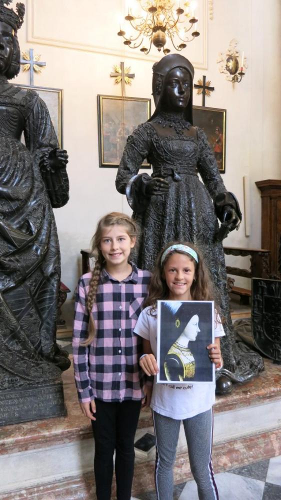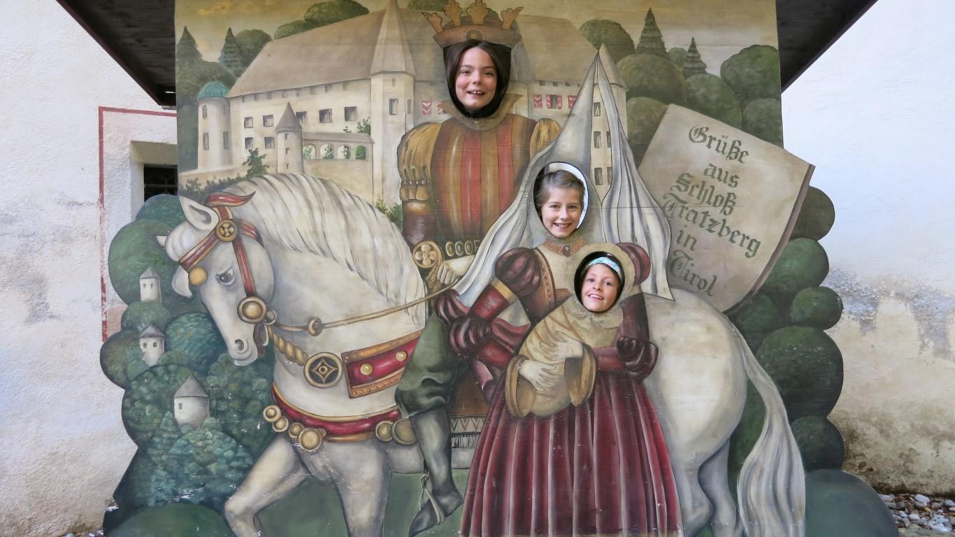Nach drei Stunden erreichten wir unser erstes Ziel. Dort angekommen brachte uns der Bummelzug zu Schloss Tratzberg. Wir bekamen einen Audioguide, mit dem wir in jedem Raum einen Teil der alten Geschichte anhörten. In der Rüstkammer bestaunten wir die Ritterrüstungen und Waffen der damaligen Zeit. Als Ritter Georg von Ilsung mit seinem Schwert auf den Boden klopfte, erschrak die ganze Klasse. Nach einem leckeren Mittagessen fuhren wir weiter nach Innsbruck, wo uns bereits unsere Reiseführerin Claudia erwartete. In der Hofkirche erzählte sie uns einiges über die 28 Bronzefiguren, das Grabmal von Kaiser Maximilian und über unseren berühmten Freiheitskämpfer Andreas Hofer, der dort begraben ist. Eindrucksvoll war auch die Hofburg, in der Maria Theresia und Kaiserin Sissi lebten. Anschließend besichtigten wir noch die Altstadt mit dem Goldenen Dachl und sahen von der Innbrücke aus auch Frau Hitt. Nach diesem spannenden ersten Tag übernachteten wir im Hotel Olympiaworld.