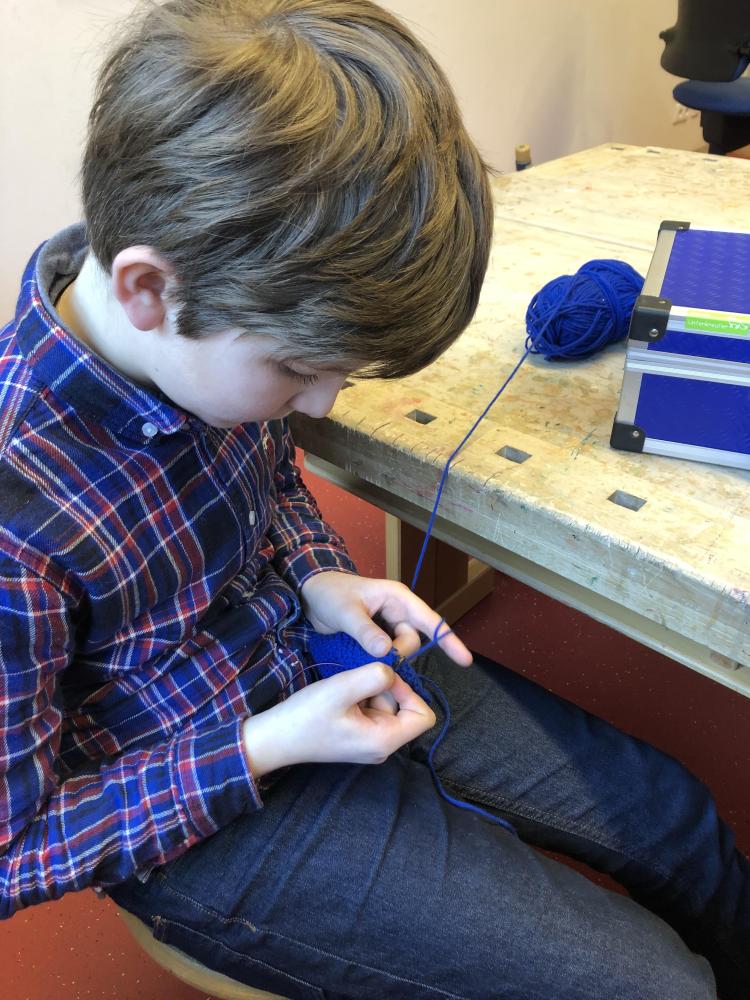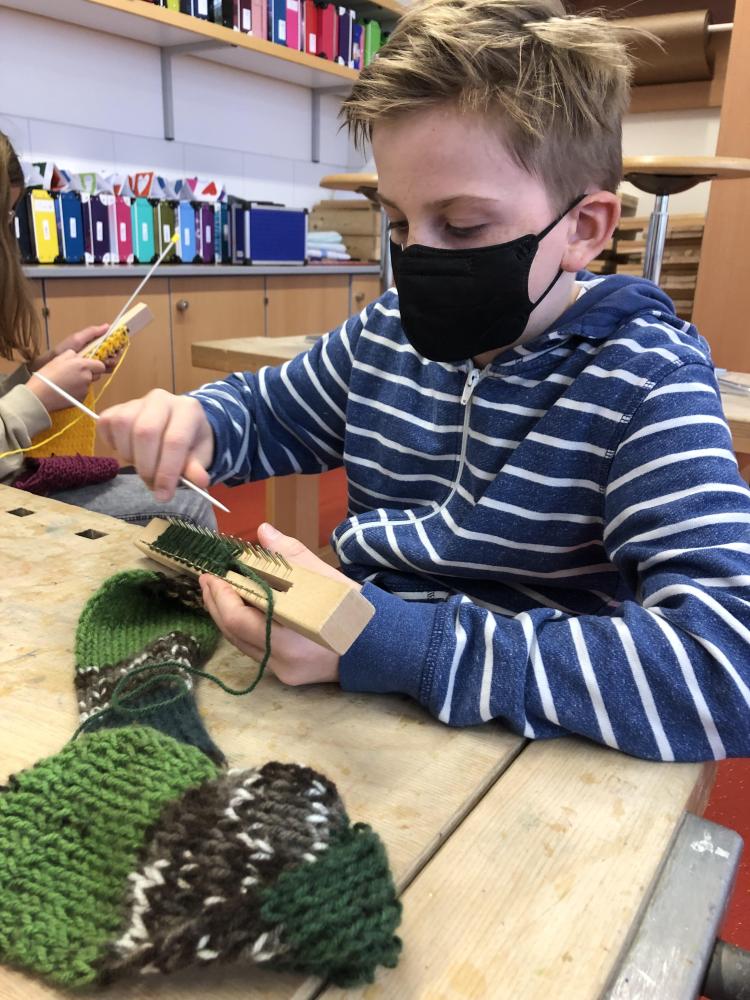 Stricken macht Spaß! von Norbert Salcher 07. März 2022 4. Klasse 2021/2022 Zuerst mit, dann ohne Strickmaschinen stellten die Kinder der 4. Klasse Schals, Stirnbänder, Pulswärmer und Schweißbänder her.